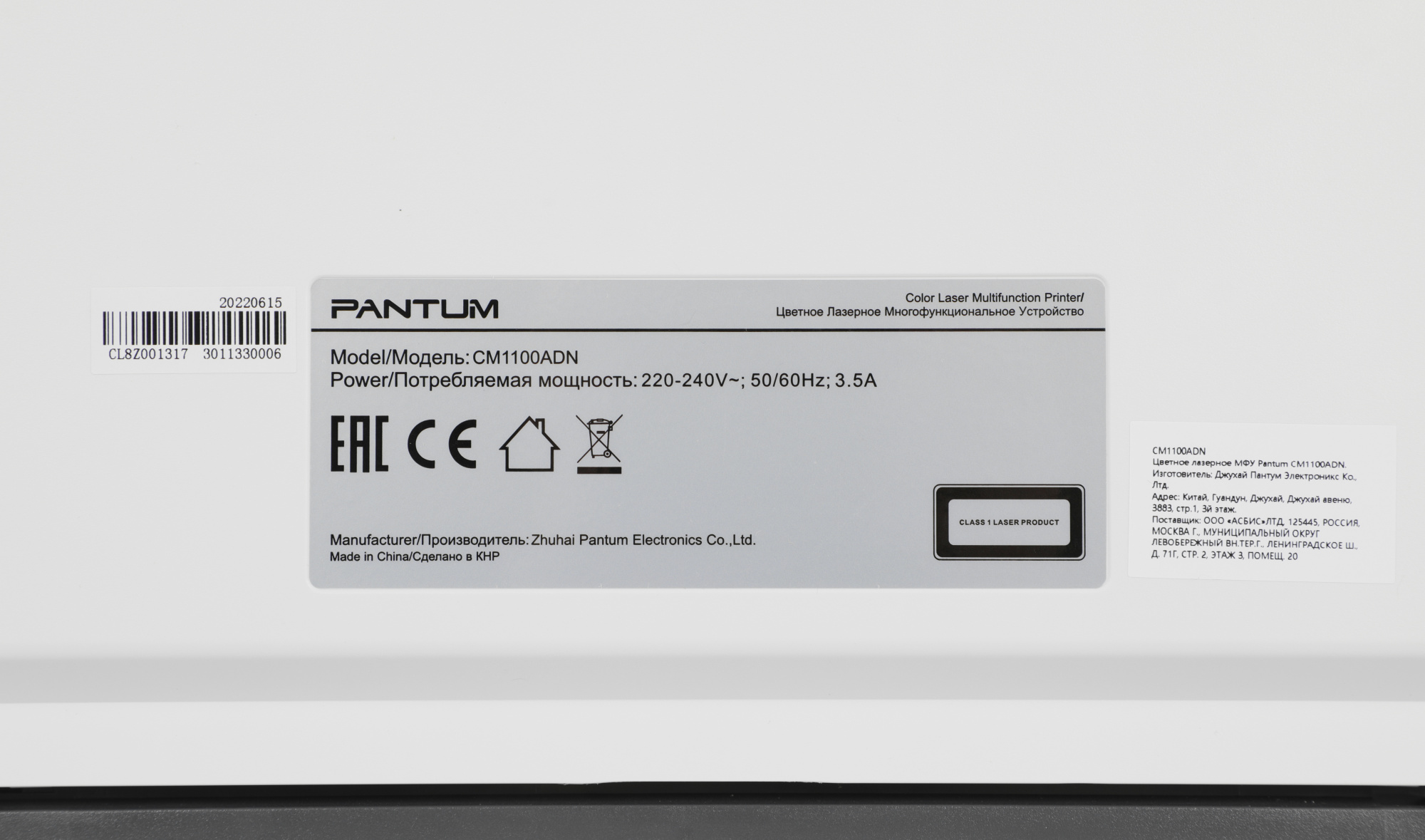 МФУ Pantum, Стартовый картридж: CTL-1100K (1,000 Страниц) CTL-1100C/CTL-1100M/CTL-1100Y (700 Страниц), Краткое руководство по установке, Шнур питания,